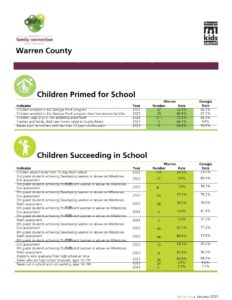 Georgia tracks 51 Indicators of Child Well-Being in five result areas that support our vision for a Georgia where all children are healthy, primed for school, and succeed when they get there; that all families are stable, self-sufficient, and productive; and that every community is vibrant, robust, and thriving.